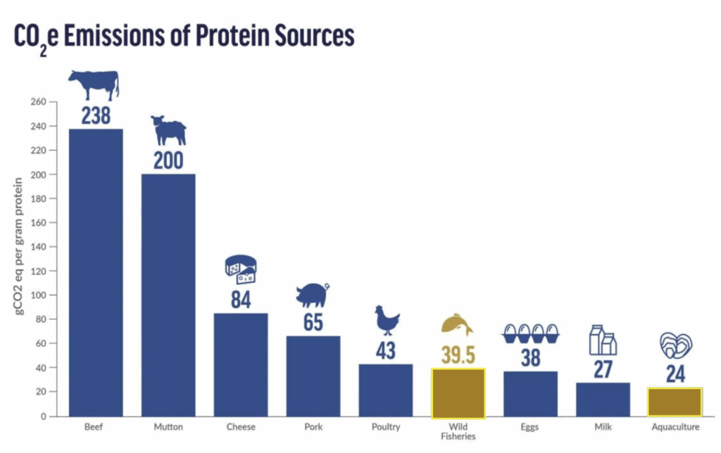 Source (2021): https://oceana.org/blog/wild-seafood-has-lower-carbon-footprint-red-meat-cheese-and-chicken-according-latest-data/